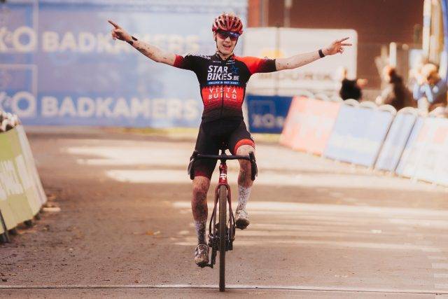Een sterk blok van StarBikes – Vistabuild in de juniorencross. Emiel Osaer ontsnapte tijdens de eerste ronde al uit een ruim deelnemersveld. Brent Lippens, Seppe Sprangers en Osaer’s StarBikes – Vistabuild ploegmaat Lars Corsus gingen met z’n drieën in de achtervolging. Enkel Corsus kon de sprong maken naar Osaer en de twee ploeggenoten maakten er een mooi duel van. Corsus kon in de voorlaatste ronde een kloof slaan en de zege binnen halen, voor Osaer en Lippens. Len Geerts kwam uit de achtergrond nog sterk terug naar de vierde plaats.